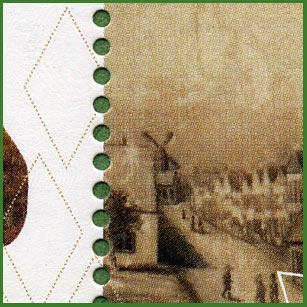 На марке мельниц нет. Изображение ветряной мельницы используется только в оформлении листка (см. фрагмент), на старинной гравюре с видом города Куворден*.