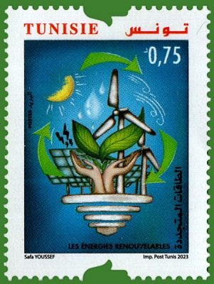 0,75 динара. Аллегорический образ альбома с марками, раскрывающего смотрящему тему сбережения энергии природы и её возобновления.