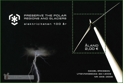 *On 22 January, Åland Post issues a miniature sheet as part of the joint stamp series ‘Preserve the Polar Regions and Glaciers’ in which more than 40 posts from around the world take part. The Åland contribution features a wind turbine, commemorating the 100th anniversary of the introduction of electricity in Åland.