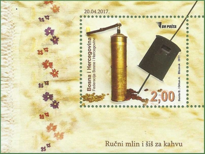 2 bosnian marks. Souvenir sheet with one stamps includes tradional coffee grinder and a device for manual roasting coffee beans.
